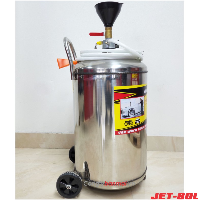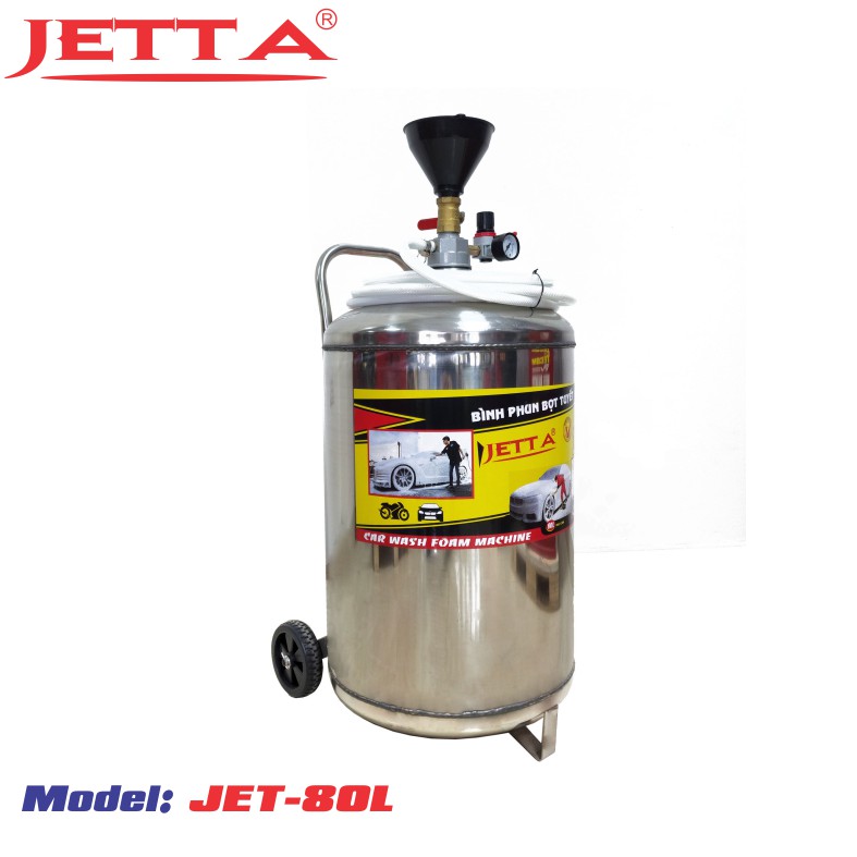 Bình bọt tuyết inox 80 lít JETTA có dung tích 80 lít, phun rửa được khoảng 30-35 ô tô và 60-65 xe máy. Với áp suất hoạt động từ 2-3 Bar (kg/cm2) bình xịt bọt tuyết này có khả năng đánh bật các vết bẩn một cách hiệu quả. Bình được làm từ chất liệu inox cao cấp, giúp đảm bảo độ bền và sự an toàn cho người dùng. Hơn nữa, bình rửa xe bọt tuyết còn được trang bị hệ thống bánh xe dễ di chuyển, giúp người dùng dễ dàng di chuyển sản phẩm trong quá trình sử dụng.