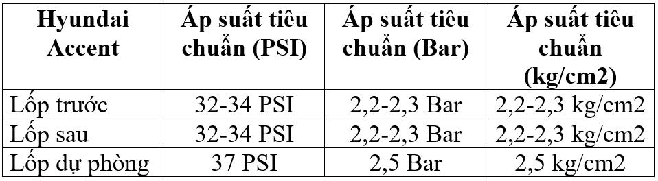 Hyundai Accent được thiết kế với mức áp suất lốp tiêu chuẩn (thường từ 32-35 PSI). Việc duy trì đúng mức này giúp xe hoạt động theo đúng tiêu chuẩn kỹ thuật của hãng.
