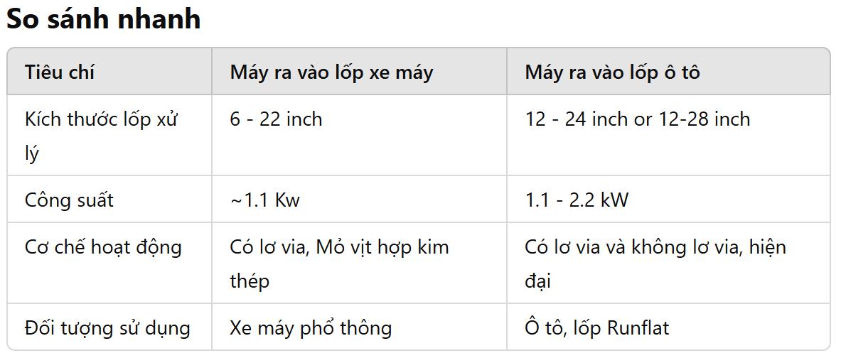 Máy ra vào lốp xe máy nhắm đến đối tượng sửa chữa và bảo dưỡng xe hai bánh, trong khi máy ra vào lốp ô tô được thiết kế để xử lý các loại lốp lớn, phức tạp, thường được sử dụng trong các gara ô tô chuyên nghiệp và dịch vụ cao cấp.