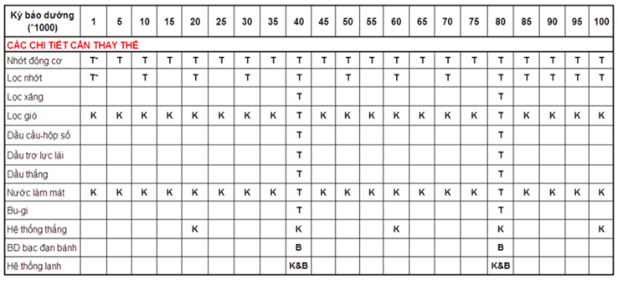 Thay lọc nhiên liệu: Thay sau mỗi 40.000-60.000 km. Bộ lọc nhiên liệu loại bỏ các tạp chất và chất gây ô nhiễm khỏi nhiên liệu trước khi đi vào động cơ. Nếu bộ lọc nhiên liệu không được thay thế đúng lịch trình, nó có thể bị tắc và hạn chế dòng nhiên liệu, dẫn đến các vấn đề về hiệu suất của động cơ.